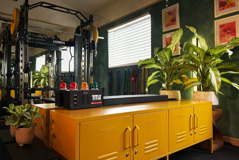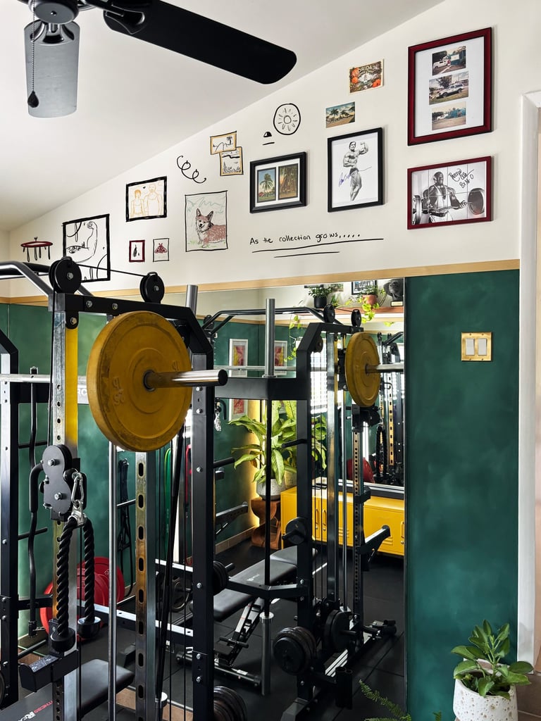 Vintage touches, personal mementos, and thoughtful details come together in harmony, creating a home gym that’s motivating, inspiring, and uniquely his. Every element—walls, workout zones, and décor—works together, proving that a functional space doesn’t have to sacrifice personality.